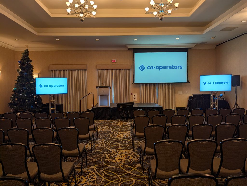 Our standard meeting setup consists of a sound system that suits the room, a podium microphone, and up to four wireless microphones (handheld, lapel or headset), presentation computers, video switcher, presenter remote and connections to in-house projectors/TVs (or we can provide them). Good for small groups up to 100 .